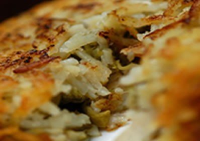Em fogo alto, coloque metade da quantidade das batatas raladas em uma frigideira anti-aderente. Logo em seguida coloque o recheio. Como uma panqueca, feche com a outra metade das batatas raladas. Despeje um fio de óleo de canola por toda beirada da frigideira. Deixe por aproximadamente 7 minutos. Após este tempo, com o auxílio de uma outra frigideira, vire o lado da batata e deixe também por 7 minutos. Sirva quente.