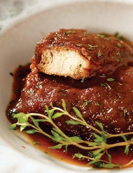 Em uma forma refratária, coloque uma camada de molho barbecue e espalhe bem. Cubra com fatias de tofu assado e não deixe espaço entre elas. Cubra com uma camada do molho e leve ao forno alto por 15 minutos ou até secar, mas sem queimar. Sirva quente acompanhado de purê de batatas e aspargos grelhados.